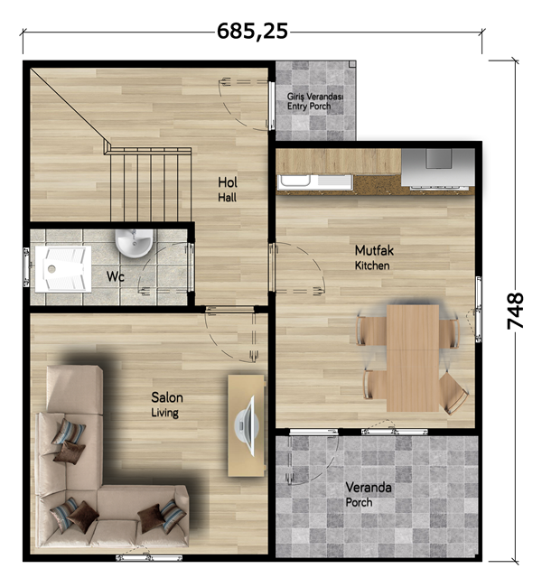| Salon | 31 m² | Mutfak | Salona Dahildir | Yatak Odası | 18 - 13 - 13 -12 m² |